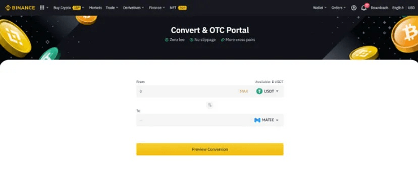 Then Click on CONVERT and select from USDT to MATIC. Input the amount you wish.