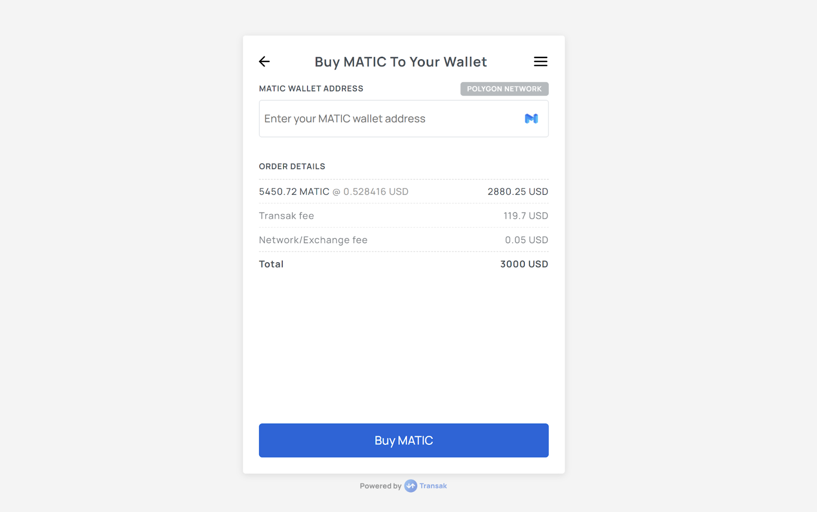 A fiat gateway like Transak enables you to exchange traditional currencies like USD, EUR, or GBP for cryptocurrency directly in your wallet. Keep in mind that these gateways usually come with higher fees, slower transaction times, and certain limitations based on your location, currency, or payment method.