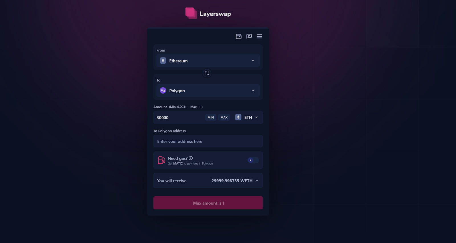 Layerswap allows you to bridge your tokens from a non-Polygon chain onto Polygon. Supported chains include Ethereum, BNB Smart Chain, Arbitrum, Optimism, Avalanche, Fantom, and more.