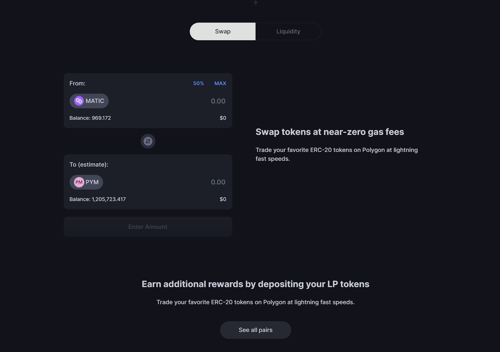 Visit QuickSwap and connect your Metamask wallet. Paste the PYM contract address 0x0bD49815EA8e2682220BCB41524c0dd10Ba71d41 in the token address field then u can start swapping