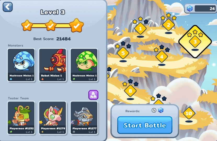 Select a level by clicking on the Level icon, represented as a diamond with a number in the center. After a level is selected you will be able to see your currently selected team of Playermons and the enemy team which you will face in the level.