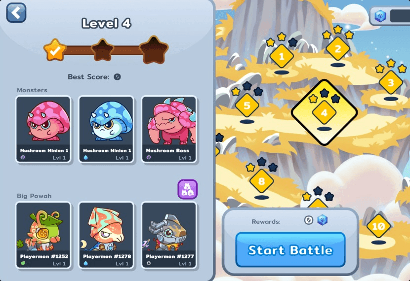 After clicking on the Adventure button, you will be brought to the Playermon PvE Adventure map. Here you will be able to progress through the levels and earn points.