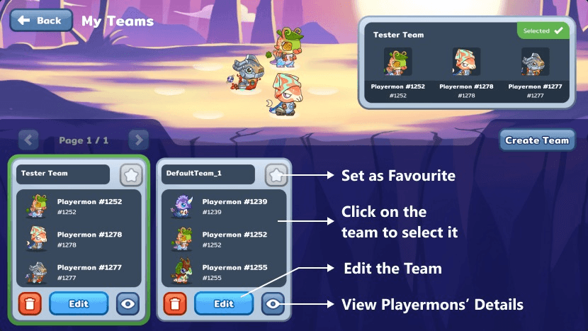 Select a Team to use for the stage you have currently selected and click on the eye button to check the current stats of the Playermons within the team. You can also choose to move to the Edit Team screen to change the Team’s Playermons.