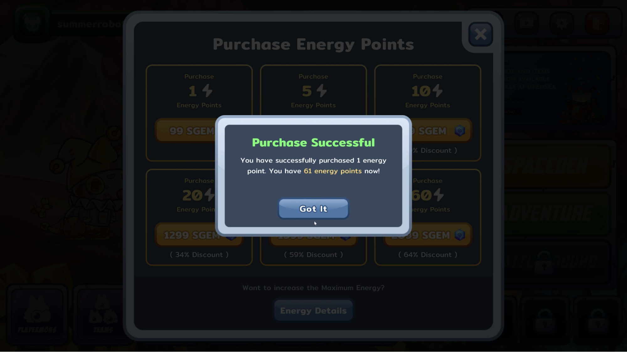 A pop-up window will appear, presenting you with different options for purchasing energy points. Remember, energy points can only be acquired using SGEM tokens. Choose the amount of energy points you wish to buy and click on it.