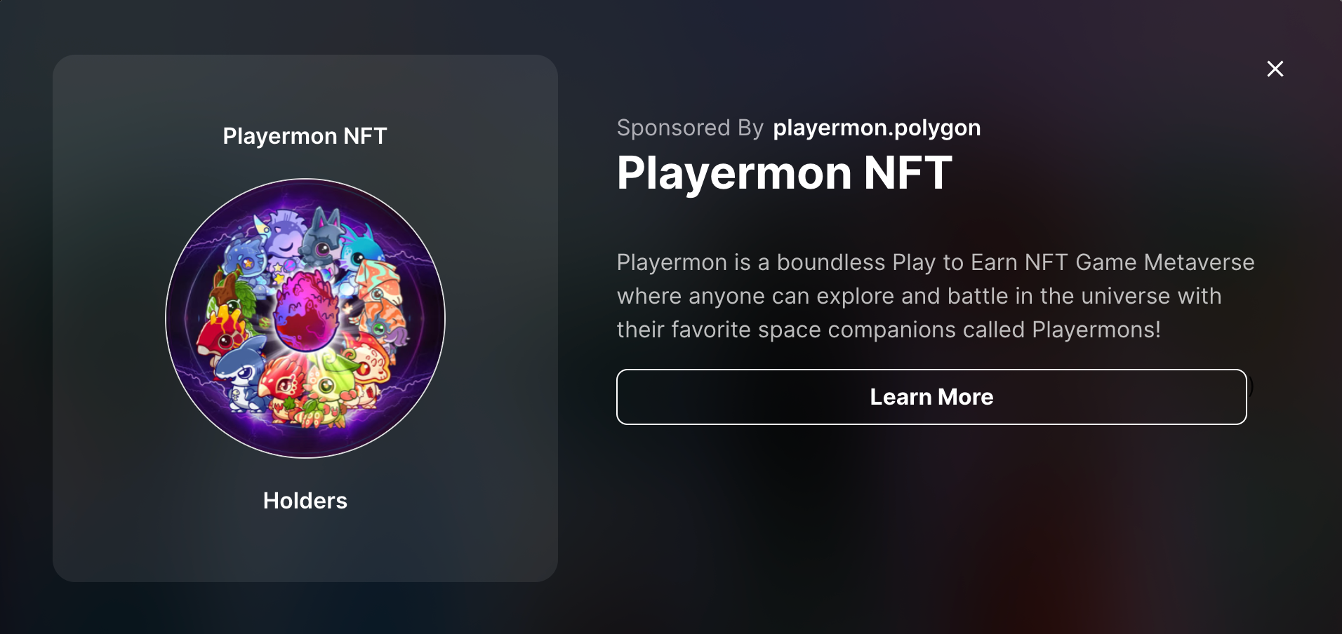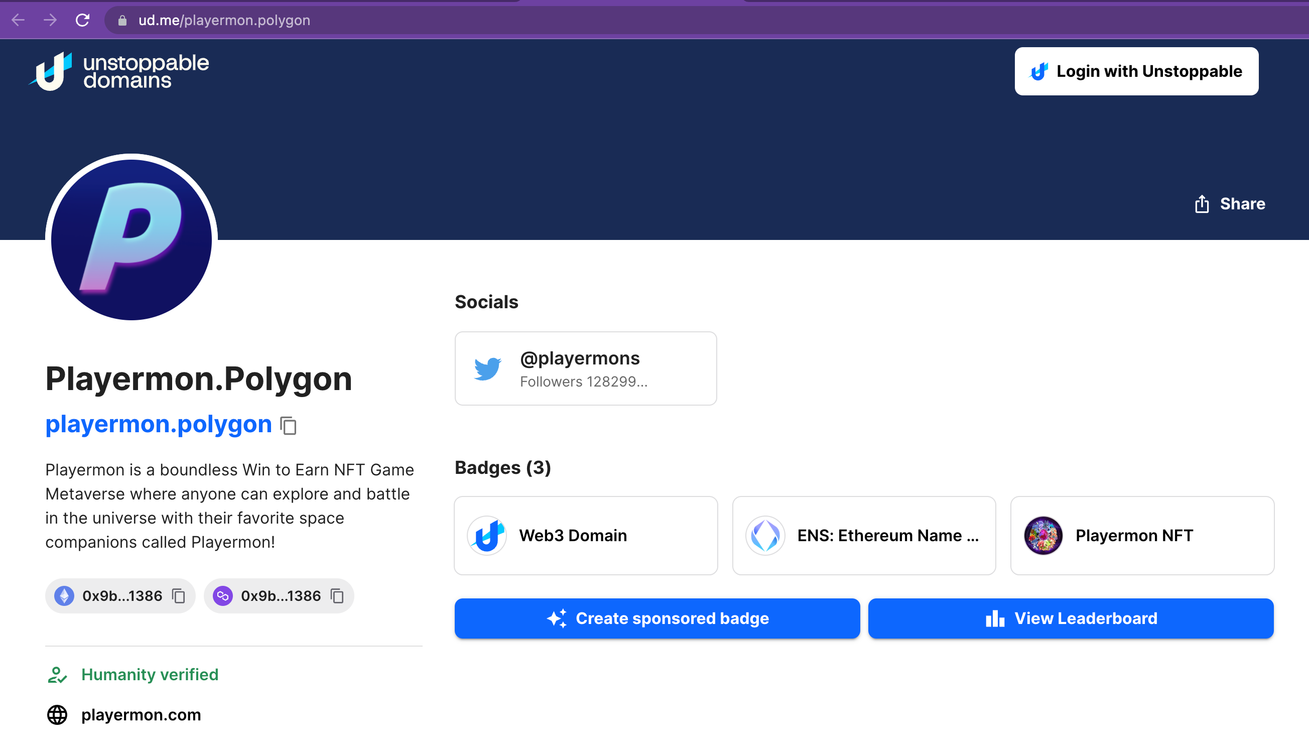 Unstoppable Domains has worked with Polygon to provide .polygon digital identities, and as part of this collaboration, Playermon has acquired the domain name playermon.polygon, giving the project a unique and easily recognizable identity within the Polygon ecosystem. In addition, Playermon is sponsoring the badge for Playermon NFT holders on the UD Profile Page, giving them a way to showcase their NFT ownership and be proud of their digital assets.