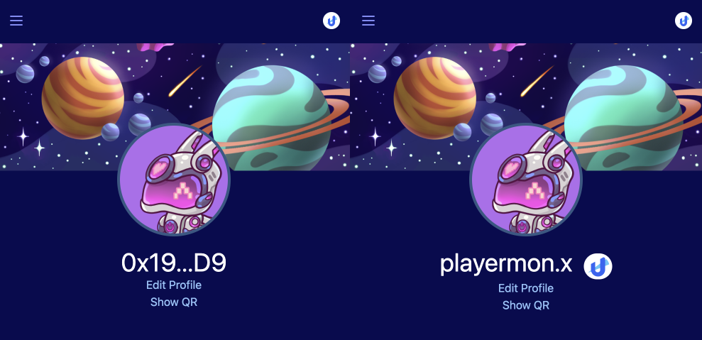 Profile on the left does not have a Unstoppable Domain, profile on the right with Unstoppable Domain