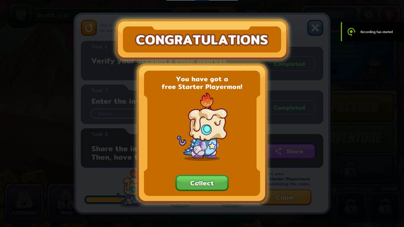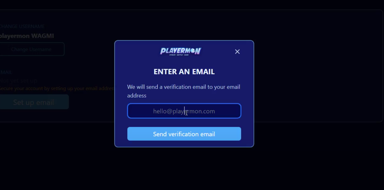 Return to the Playermon page. You'll receive a verification success prompt confirming your email. Congratulations! You have completed your first task, and now you're able to claim 3 starter Playermons.
