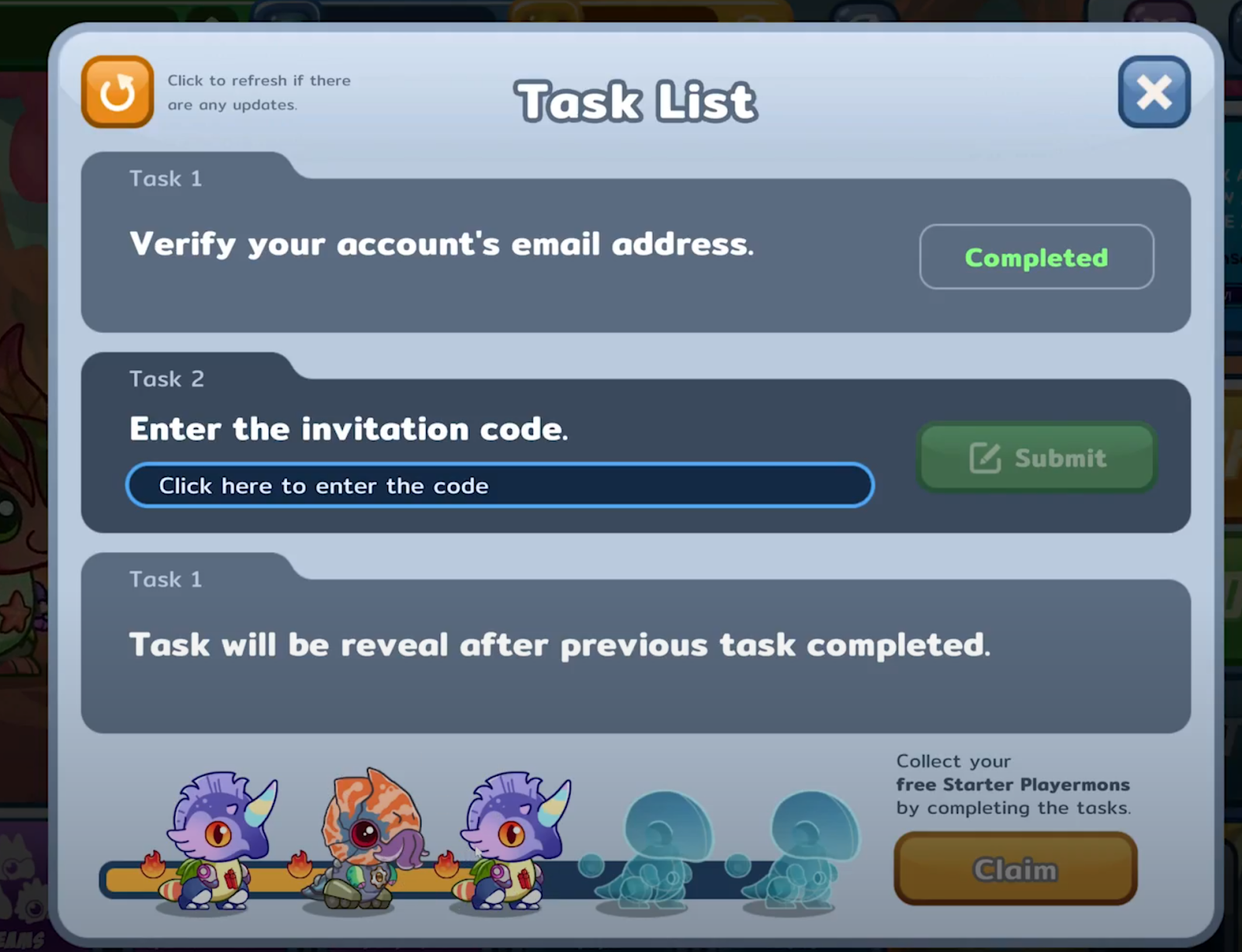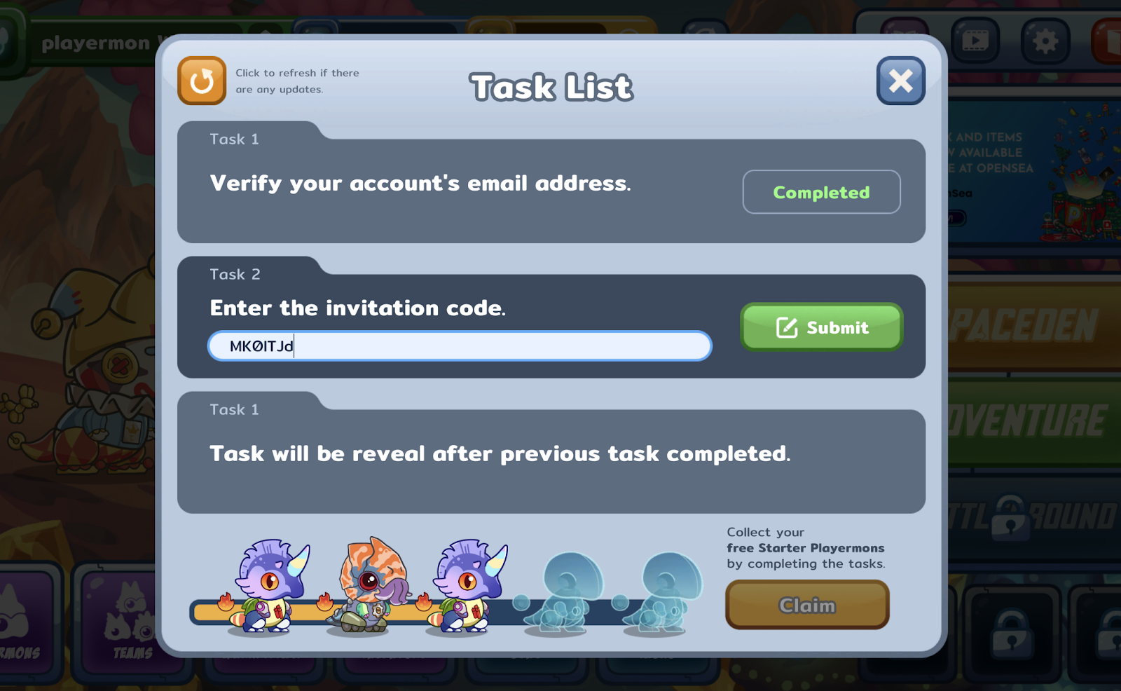 For the next task, enter an invitation code in playermon app task list. You can obtain your unique invitation code from our active community or from your friends. After submitting, congratulations! You are now qualified to claim 1 free starter Playermon.